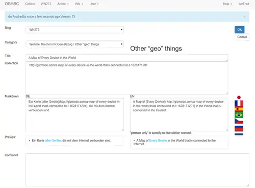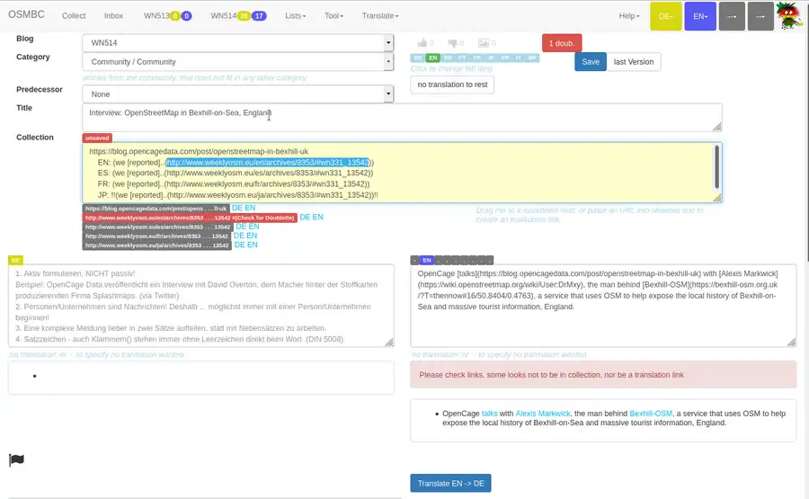 theFive wrote a dedicated content-management system: OSMBC (OSM Blog Collector) back in mid 2015, especially designed for the needs of Wochennotiz and weeklyOSM. This system has been in use since WN 272. OSMBC allows news articles to be "collected" by the weeklyOSM team. This process previously was done entirely by the German Wochennotiz team. Later English and Spanish translations of Wochennotiz were managed within the tool, but these days increasingly articles are collected in different languages and cross-translated in a flexible workflow enabled by the OSMBC software. Despite the name, it is not limited to blogs. The team also checks international mailing lists and other channels to include any news that is relevant. The system supports "markdown" formatted text, for each article, and groups them into categories. These are ultimately converted to HTML and put into the wordpress blog each week. |