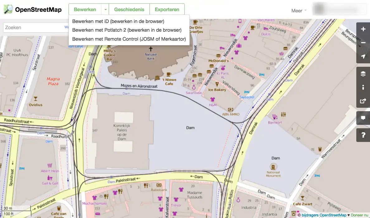 Voor dit voorbeeld en de screenshots gebruik ik onder andere de Dam in Amsterdam als voorbeeld. Ingezoomd tot het hoogste niveau. Ik laat voorbeelden zien in iD en JOSM.