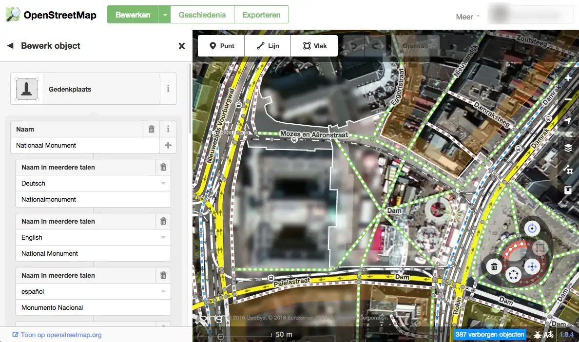 Maar uiteraard kun je ook alle gegevens laten zien die zich op de kaart bevinden, en dat is in onderstaand plaatje te zien. Tevens heb ik hierbij weer het monument op de dam geselecteerd en zie je rechts dezelfde velden die je ook in iD zag. Daaronder de knoppen waarmee je tags kunt toevoegen of bewerken.