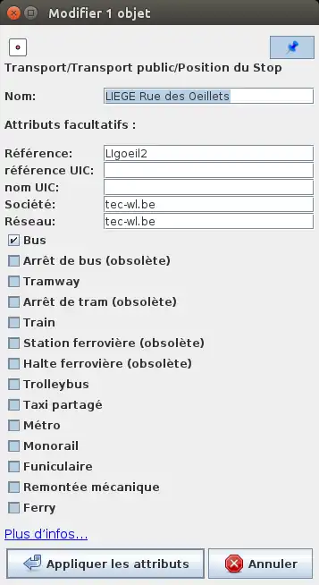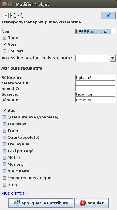 Dans JOSM, vous pouvez accéder à une fenêtre simple de modification, par le menu "Attributs > Transports > Transports Publics > Plateforme". Vous aurez alors la fenêtre suivante :