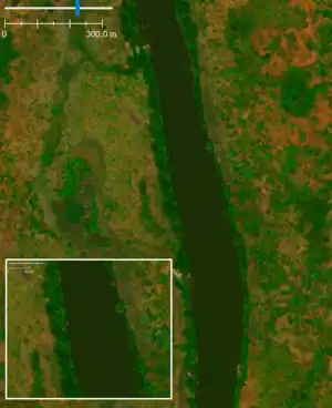 Berge | Si une berge est visible sur l'imagerie satellite, elle doit être cartographiée comme un polygone. Une ligne pour la voie waterway=river doit être dessinée à l'intérieur de la berge comme indiqué sur la photo.