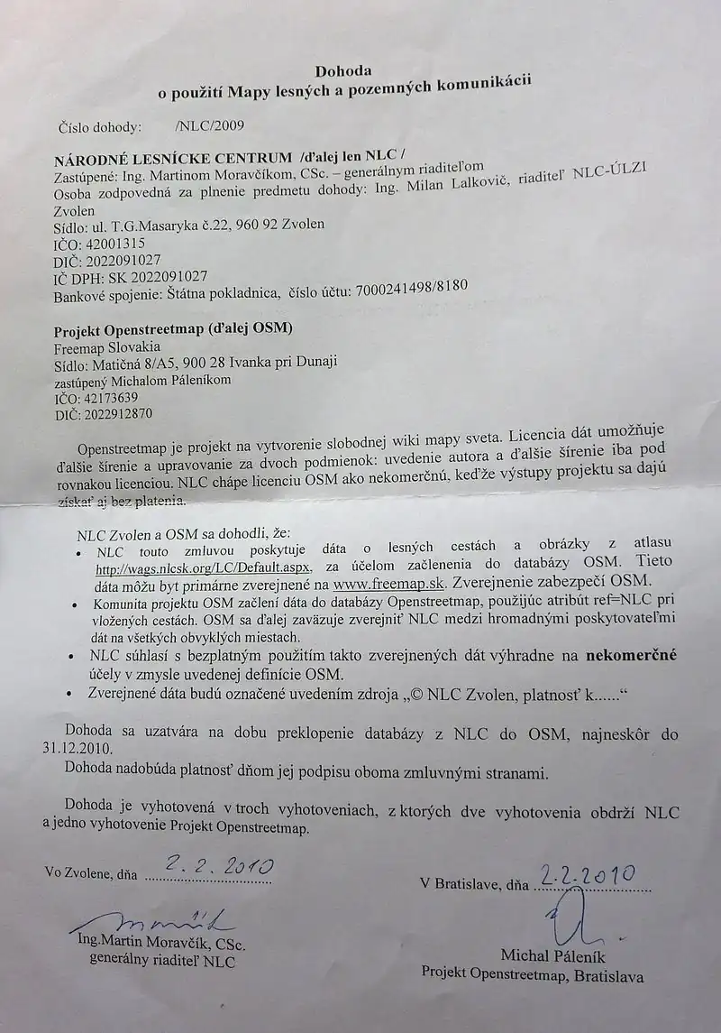 Agreement between Geodetický a kartografický ústav Bratislava (Cartography and Cadastre Authority) and Freemap Slovakia. Agreement is valid for 5 years from June 25, 2018.