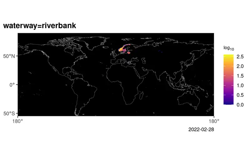 28 February 2022: Color-coded world map which shows the distribution of deprecated waterway=riverbank in heatmap form.