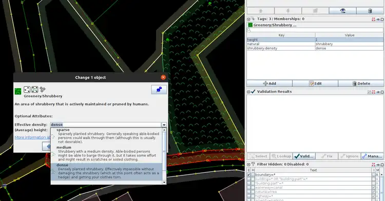 shrubbery:density=dense areas of natural=shrubbery are rendered with a suitable pattern.A matching Preset (Greenery) is available as well: