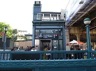 The 161st Street–Yankee Stadium station is a New York City Subway station complex shared by the elevated IRT Jerome Avenue Line and the underground IND Concourse Line. It is located at the intersection of 161st Street and River Avenue in the Highbridge and Concourse neighborhoods of the Bronx. It is generally served by the 4 train at all times; the D train at all times except rush hours in the peak direction (unless there is an event at Yankee Stadium[4]); and the B train during weekday rush hours and middays.