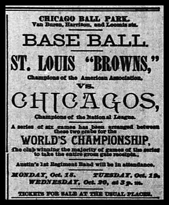 The two teams agreed to meet each other in a best-of-seven pre-modern-era World Series, with the winner taking all the prize money.[3][4] It was the second straight year that the Browns and White Stockings met in the World Series.[5] The six games of the series were played on six consecutive days.[6] The first three games were scheduled for Chicago, with the next three games to be held in St. Louis.[2] A decisive seventh game, if necessary, was to be held in a neutral site.[2] The location of the rubber game in the match was to be determined by coin toss, with each franchise owner selecting a city for the game.[7]
