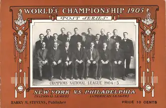 The 1905 World Series was the championship series in Major League Baseball for the 1905 season. The National League (NL) champion New York Giants defeated the American League (AL) champion Philadelphia Athletics, with the Giants winning 4 games to 1, now in a best-4-of-7 format. Four of the five games featured duels between future Hall of Fame pitchers. The games were the second edition of the World Series after the initial meeting in 1903, since the 1904 season ended with no Series held, and the first to be officially sanctioned by the leagues and the National Baseball Commission.[1]