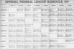 The Federal League had its Opening Day on April 13, with a game between Buffalo and Baltimore.[3] Opening Day for the American and National Leagues was on April 14, and featured all 16 teams of those leagues,[4] only the third time those two leagues started their season on the same day (the 1912 season had been the second). The National League had its final day of the regular season on October 6,[5] while the American League's final day of the regular season was October 7.[6] The World Series between AL and NL champions took place between October 9 and October 13.[7] The Federal League had the final day of its regular season on October 10.[8]