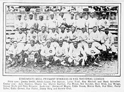 In August, the Reds begin to pull away from the Giants, as on August 26, Cincinnati had a record of 81-34 and had built a nine-game lead over New York. Also in August, there were accusations that the teams playing the Reds were throwing their games to allow the Reds to win.[2] The Reds continued to win in the last month of the season, and on September 18, Cincinnati defeated the Brooklyn Robins 2–0 to win their 93rd game of the season, which set a team record, besting the 92 wins the club had in 1898. Overall, Cincinnati finished the season with a 96–44 record, cruising to the National League pennant, as the team finished in first place for the first time since 1882. The Reds qualified for the 1919 World Series, as they would face the American League champions, the Chicago White Sox.