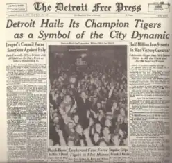 Delirious Detroit fans rushed onto Navin Field in celebration after Goslin's game-winning hit. The celebration spilled out onto Michigan Avenue and Trumbull. People from throughout Detroit flooded the central city in a celebration that newspapers reported went on until three in the morning. For a few hours, the worries of the Great Depression were gone and the only thing that mattered was the Tigers.