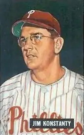 November 2 – Philadelphia Phillies relief ace Jim Konstanty is selected the National League MVP for 1950. Appearing in a record 74 games, he won 16 games, saved 22 others, and started his team's first World Series game in 45 years. The veteran 33-year-old moundsman amasses 18 of 24 first-place votes, and outpaces 3x former MVP Stan Musial.