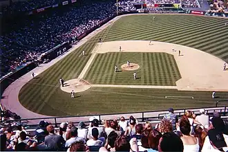 ![]() Yankees' fielders huddling on the pitcher's mound during an August 2001 away game | |