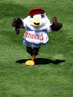 Screech, the mascot of the Washington Nationals, made his debut near the beginning of the 2005 season. A bald eagle who wears the home cap and jersey of the team, he was "hatched" on April 17, 2005, at the "Kids Opening Day" promotion at Robert F. Kennedy Memorial Stadium during the third home game in Nationals history, a game against the Arizona Diamondbacks. A nine-year-old fourth-grade student in Washington, Glenda Gutierrez, designed the mascot and won a contest sponsored by the team, explaining that Screech was "strong and eats almost everything." The first, chubby version of Screech appeared during the team's first four seasons in Washington; just before the start of the 2009 season, the Nationals replaced him with a thin version who debuted in March 2009, explaining that Screech had "grown up" and become a "teenager."[10]