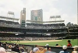 Chris Young pitching against the Cubs at Wrigley Field on June 16; he was working on a no-hitter but was later ejected from the game after he and Derrek Lee got into a fight that turned into a bench-clearing altercation.
