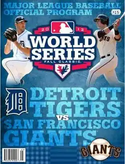 The 2012 World Series was the championship series of Major League Baseball's (MLB) 2012 season.[1] The 108th edition of the World Series, the series was a best-of-seven playoff between the National League (NL) champion San Francisco Giants and the American League (AL) champion Detroit Tigers; the Giants won in a four-game sweep. This marked the Giants' seventh World Series title in franchise history, their second in San Francisco (they won five in New York), and their second in a three-year period (2010–2012). Their World Series sweep was the first by an NL team since the Cincinnati Reds swept the Oakland Athletics in the 1990 series and the first NL sweep not by the Reds since 1963, when the Los Angeles Dodgers swept the New York Yankees. This was also the first World Series since 1988 to feature both of that year's League MVPs (Miguel Cabrera for the AL and Buster Posey for the NL). The Giants' Pablo Sandoval, who in Game 1 tied a record by hitting three home runs in one World Series game — two off Tigers' ace pitcher Justin Verlander — was named the World Series Most Valuable Player (MVP).