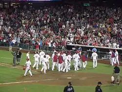 On August 16, 2013, the Phillies fired manager Charlie Manuel replacing him with third base coach Ryne Sandberg on an interim basis.[2] At the time, the Phillies were 53–67, and Manuel had exactly 1,000 wins with the Phillies, a milestone he achieved on August 12.[3] The league and fan base mostly expressed sadness and gratitude to Manuel for his tenure.[4] Several Phillies veterans, including Chase Utley and Cole Hamels, expressed regret and guilt feeling their lack of production led to Manuel's firing; they viewed Manuel as a fatherly figure.[5] Sandberg commented the next day, "It was a roller coaster of a day emotionally. It affected me and I think it affects the players."[6] Manuel received significant accolades within the media for his class in handling the situation,[2] while the Phillies organization, namely general manager Rubén Amaro, Jr., were criticized within the media for firing Manuel at that point in the season,[7][8] as well as for not having better players.[9][10][11]