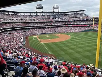 Due to the COVID-19 pandemic, no fans were in attendance at any MLB games in 2020 until the National League Championship Series.[13] On November 12, 2020, Commissioner of Baseball Rob Manfred said that the MLB would be "more aggressive" about having fans in ballparks, but that in-person attendance was still dependent on local public health authorities.[14] On March 2, the City of Philadelphia announced that, beginning on Opening Day, Citizens Bank Park would be allowed to host fans at 20% capacity (8,800 attendees).[15] Citizens Bank Park implemented a new set of rules for all game attendees, including a face mask requirement, a ban on backpacks and purses, and the use of cashless payments at concession stands and team stores.[16] Additionally, attendees were to be seated in "pods" of between two and six seats, evenly dispersed across the ballpark. All other seats were cordoned off to enforce social distancing.[17]