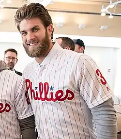 On March 15, 2022, Brad Hand and Jeurys Familia both signed one-year contracts with the Phillies.[27] On March 20, Kyle Schwarber signed a four-year, $79 million contract, making him the Phillies' first high-tier acquisition of the offseason.[28] On March 23, 2022, Nick Castellanos agreed to a five-year, $100 million contract with the Phillies, putting them over the luxury tax. Castellanos announced the deal by posting a picture of the Philadelphia skyline on his Instagram page.