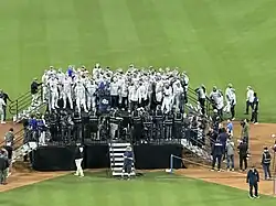 The Dodgers clinched their 12th consecutive postseason berth on September 19, which remains the longest active playoff streak in major North American professional sports. It also extended the longest playoff streak in franchise history.[4] On September 26, the Dodgers won the National League West division for the third consecutive season and the 11th time in the past 12 seasons. The Dodgers remained in first place in the division for the entire season (making their postseason World Series victory a wire-to-wire win); The Dodgers finished the season with a 98–64 record, the best in the majors, and home field advantage throughout the playoffs.[5] For the third time in five years, they faced their division rival San Diego Padres in the National League Division Series, which they won the series in five games to advance to the National League Championship Series. They beat the New York Mets in six games to win their first NL pennant since 2020 and 25th overall. They faced the New York Yankees in the World Series, the twelfth meeting between the two clubs in the World Series and the first since 1981. The Dodgers won the series in five games for their eighth World Series championship. The Series was highlighted by Freddie Freeman's walk-off grand slam in Game 1, which many compared to Kirk Gibson's Game 1 walk-off home run in the 1988 World Series.[6][7][8]