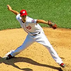 Cole spent the 2016 season again pitching in Syracuse's rotation. Working exclusively as a starter, he pitched to a 4.26 ERA (up by more than a full run from 2015) over 22 games, including two complete-game performances, before he was called up by the Nationals on August 18, 2016, to fill in as a reliever.[20] Due to the Nationals' acquisition of closer Mark Melancon in July, who wears the number #43 as a Washington player,[21] Cole exchanged his number #43 for #22 upon being called up.[22] Cole was placed in the Nationals' rotation later in the month after Stephen Strasburg went on the disabled list. He notched his first career win on September 2, 2016, against the New York Mets, giving up just one earned run on three hits and two walks over six innings on the road.[23] On September 26, Cole was ejected for the first time in his Major League career after throwing a pitch behind Jung-ho Kang. Thereafter, tempers flared with the benches clearing, but the Nationals nonetheless won 10–7 over the Pirates.[24]