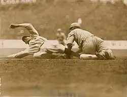 At a barnstorming game in Greenville, South Carolina on April 7, 1920, Ward collided with Chuck Ward of the Brooklyn Robins, sliding into second base on a retreat. Aaron Ward spiked Chuck Ward's right hand in multiple places, while Aaron Ward injured his right knee on the slide. Ward left South Carolina for New York City to have the leg looked at and was hopeful that his infielder would be able to play games between the two teams at Ebbets Field.[11] Ward's first full season came in 1920 with the retirement of Baker, however. Ward got full playing time as a third baseman for the Yankees, becoming one of the regular clutch hitters on the Yankees.[12]