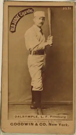 Dalrymple started his major league career in 1878 with the National League's Milwaukee Grays, and that season, he had a career-high .354 batting average.[1] He spent the next eight seasons with the Chicago White Stockings, for whom he starred as the leadoff hitter on five NL pennant winners. In 1880, Dalrymple led the league in hits (126) and runs scored (91). In 1881, he became the first batter known to be given an intentional walk with the bases loaded. He hit four doubles in a game in 1883, which still ties him for the major league record. In 1884, aided by the short right field fence at his home park, Dalrymple hit a career-high 22 home runs and moved into sixth place on the all-time home run list. On the strength of 11 home runs for the 1885 champions, he moved up one place. For the remainder of his career, he hit only six home runs. His hitting declined in 1886, and his major league career ended five years later.