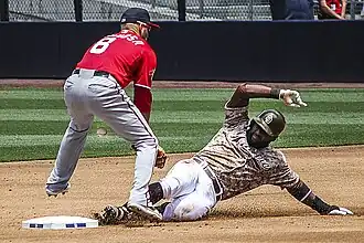 On July 31, 2014, the Mariners traded Almonte and Stephen Kohlscheen to the San Diego Padres for Chris Denorfia.[13] With the Padres through the remainder of the season, Almonte batted .265 in 32 games.[12] During 2015, Almonte appeared in 31 games for San Diego, compiling a .204 batting average.[12]
