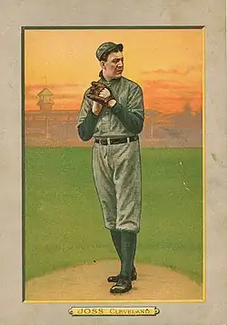Joss' repertoire included a fastball, a "slow ball" (today known as a changeup), and an "extremely effective" curve.[29] Baseball historians Rob Neyer and Bill James ranked Joss' fastball third (1900–1904) and sixth (1905–1909) in the major leagues.[30] George Moriarty explained that Joss had only one curveball because "he believed that with a few well mastered deliveries he could acquire great control and success with less strain on his arm."[31] In an era filled with spitball pitchers, Joss achieved his success without ever altering the baseball. Joss threw with a corkscrew windup motion, described as "an exaggerated pinwheel motion."[32] Shortstop Roger Peckinpaugh described his windup: "He would turn his back toward the batter as he wound up, hiding the ball all the while, and then whip around and fire it in."[33]