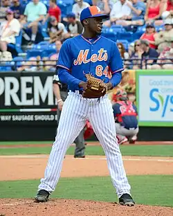 Morris began the 2015 season with the St. Lucie Mets of the High-A Florida State League (FSL), for whom he was 0–1 with a 1.69 ERA with 46 strikeouts and 13 saves in 32 innings, and was a mid-season FSL All Star.[11] On June 15, 2015, Morris was promoted to the major leagues for the first time.[12] He made his MLB debut on June 18 against the Toronto Blue Jays at Rogers Centre in the eighth and allowed five runs on three hits and three walks in 2⁄3 of an inning; it was his one MLB appearance for the season.[13] To make room for Logan Verrett, Morris was sent to the Binghamton Mets, for whom he was 0–1 with a 2.45 ERA and 35 strikeouts across 29+1⁄3 innings pitched.[14] Between the two minor league teams, he allowed 4.1 hits per 9 innings, and struck out 11.9 batters per 9 innings.[15] He was named a 2015 MiLB Organization All Star.[11]