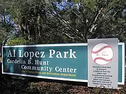 Al López Field was demolished in 1989 to make room for a potential major league facility that was never built. López lived a few miles from the ballpark that bore his name. In a 1992 interview, he said that the razing of the stadium "wasn't very disappointing. I saw a diagram of the new stadium, and I didn't feel bad because I thought they were going to build a bigger one and a better one. After that, something happened, and they never built the ballpark. Then it was a disappointment."[34] Soon thereafter, the city of Tampa changed the name of Horizon Park, a large city park near the site of the razed stadium, to Al López Park, and installed a large statue of López in his catching gear.[35] The statue was dedicated on October 3, 1992, a date which was officially proclaimed as a second "Al López Day" in the city.[36] Soon thereafter, his high school, Jesuit High School, which is located across the street from Al López Park, named its new athletic center in Lopez's honor.[37]