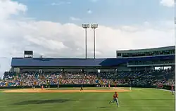 By 1925, nine of the twelve major league baseball teams were playing spring training games in Florida and they formed what was to become known as the Grapefruit League. Of the nine teams, none were as important or as well known as the New York Yankees with their lineup of baseball's greatest players to include Babe Ruth. Along with the Yankees came New York's many newspapers and numerous baseball reporters. The resulting effect of daily dispatches using a “St. Petersburg, Florida” dateline provided the city with immeasurable publicity across the country.[3] In response to Lang's efforts over the years, the city constructed a new baseball park named for him and opened it in 1947 to great fanfare. The new park, called Al Lang Field hosted many major league teams over the ensuing decades to include the New York Giants, the St. Louis Cardinals and the Tampa Bay Rays.
