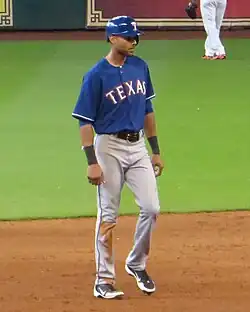 On August 8, 2013, Ríos was claimed off waivers by the Texas Rangers, and was traded to them on August 9 for a player to be named later or cash considerations.[17] Leury Garcia was announced as the player to be named later on August 11.[18] He became the team's starting right fielder, replacing the suspended Nelson Cruz. Rios hit for the cycle against the Houston Astros on September 23, 2013.[19] In all of 2013, Ríos hit .278/.324/.432 with 18 home runs, 81 RBI and 42 stolen bases.[3] For the 2014 season, he batted .280 with four home runs, 54 RBI and 17 stolen bases in 131 games.[3] The Rangers declined Ríos' option for the 2015 season on October 15, 2014, making him a free agent.[20]