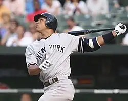 On April 23, Rodriguez became the first player in major league history to hit 14 home runs in a span of 18 games, and also tied the MLB record for most home runs in April. His total of 34 RBIs in April was one short of Juan González's AL and MLB record.[87] In a game against the Toronto Blue Jays on May 30, Rodriguez sparked controversy when he shouted during a routine play and an infielder let a pop fly drop, costing the Blue Jays three runs. The Yankees went on to win the game, 10–5.[88] On July 12, Rodriguez hit his 150th career home run in a Yankees uniform. This made him the first, and so far only, player in major league history to ever hit 150 home runs for three different teams.[89] He became the third player to hit at least 100 home runs for three teams, following Reggie Jackson and Darrell Evans.[90]