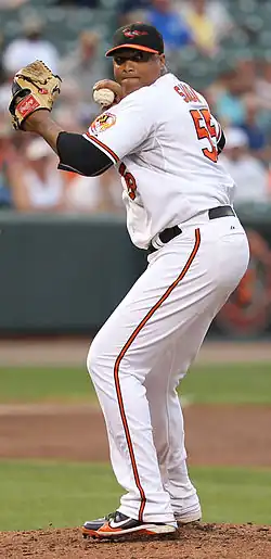 Simón failed to make the Orioles out of spring training in 2010, but on April 27, the Orioles promoted Simón from Triple-A Norfolk.[13] The same day, he became the Orioles' closer (due to bad pitching and a subsequent injury to Mike Gonzalez), and he notched his first save against the New York Yankees. He pitched an inning and gave up no earned runs (and two unearned).[14] Coincidentally, the Yankees were the same team Simón earned his first decision against.[15] Simón converted his first five save opportunities before blowing one against the Cleveland Indians on May 15.[16] In 49 relief appearances, Simón was 4–2 with a 4.93 ERA while converting 17 of 21 save opportunities.[5] After blowing a save on August 9, he did not receive another save opportunity as Koji Uehara was used most often in the role.
