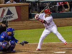 In the World Series, Craig debuted in Game 1 by hitting a two-out, go-ahead pinch-hit single off Texas Rangers' pitcher Alexi Ogando's fastball. The next night, La Russa again summoned Craig to pinch hit against Ogando. This time, he lined a 96 miles per hour (154 km/h) fastball to right field to break a scoreless tie. On that single, he joined Dusty Rhodes, Del Unser and Hal McRae as the only players to collect pinch-hit RBI in three consecutive postseason at bats. He also joined Duke Snider and Amos Otis as the only hitters with the go-ahead hit in the sixth inning or later in consecutive World Series games. Further, Craig became the first player with two go-ahead RBIs as a pinch-hitter in World Series play.[16] After hitting the go-ahead home run in Game 7, which tied a World Series record Kiki Cuyler and Hank Greenberg shared with three game-winning RBI, Craig caught the last out of the Series, securing the Cardinals' eleventh World Series championship.[21] For the series, Craig appeared in all seven games and collected five hits in 19 at-bats (.263 batting average), three home runs and five RBI for a .737 slugging percentage.[12] His totals in the 2011 postseason included a .622 slugging percentage and 1.013 on-base plus slugging (OPS).[22] However, with his knee cap still not fully healed, Craig elected to have surgery to repair the fracture the following November.[19]