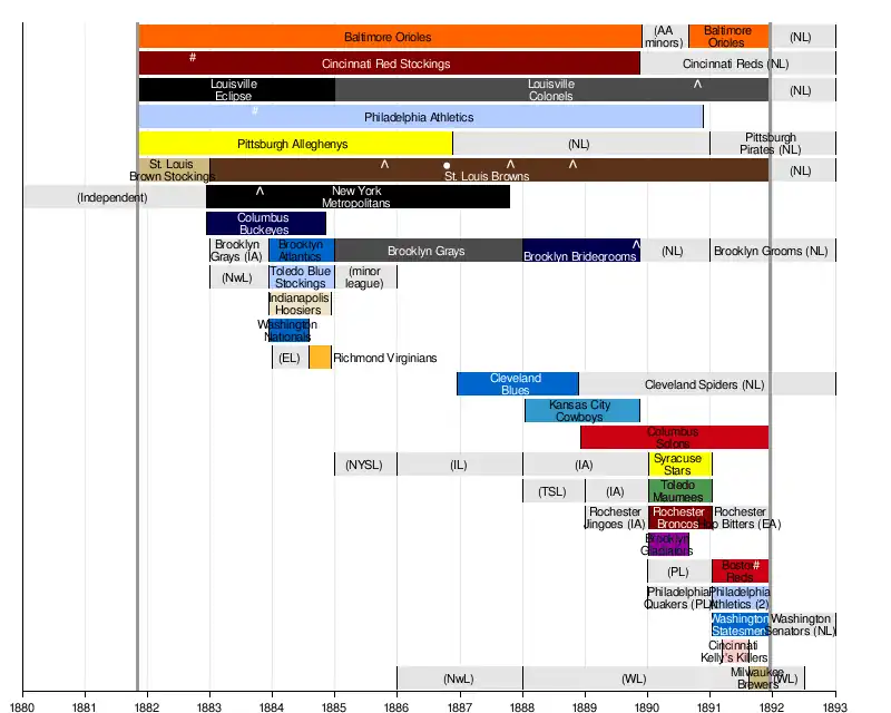 The first line is the formation of the American Association (AA) in 1882, and the second marks the end of the American Association.