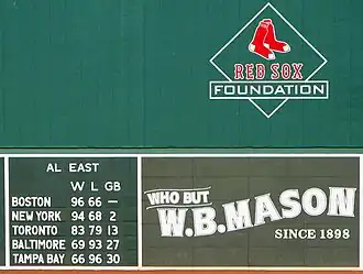 A partial view of the Green Monster at Fenway Park, with the final standings of the AL East at the conclusion of the 2007 season.