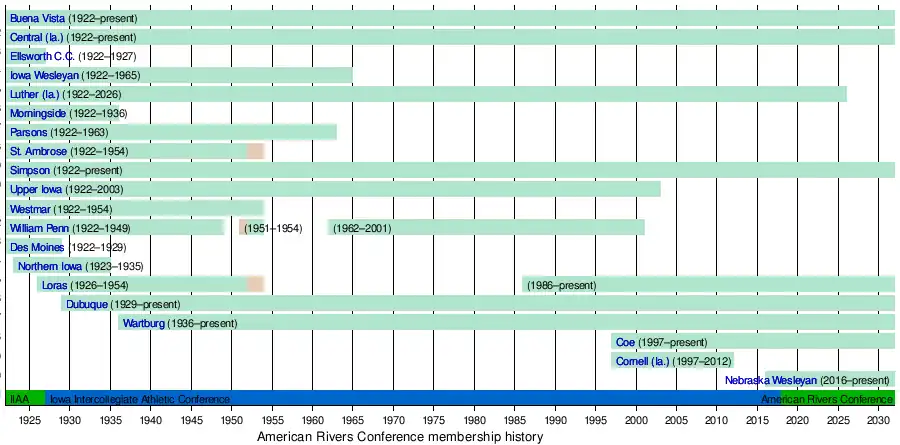 The conference expanded beyond the borders of Iowa in 2016 with the addition of Nebraska Wesleyan University.[3] On August 9, 2018, the league changed its name to the American Rivers Conference to reflect its current makeup.[4]