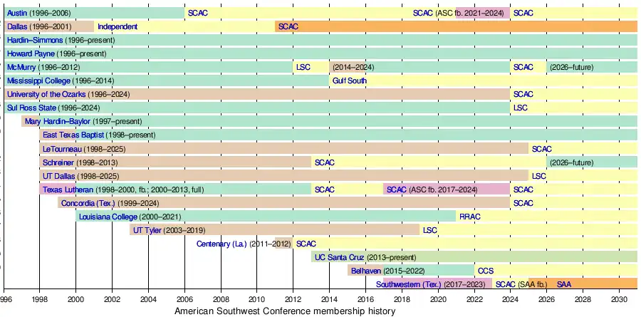 - ^ "American Southwest Conference Celebrates 10-Year Agreement and Membership Expansion" (Press release). American Southwest Conference. March 18, 2025. Retrieved March 18, 2025.