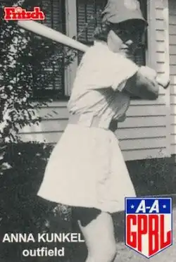 Anna Maggie Kunkel [Huff] (March 18, 1932 – October 1, 2006) was an American fourth outfielder who played in the All-American Girls Professional Baseball League (AAGPBL). Listed at 5' 2", 112 lb., Kunkel batted and threw left handed. She was dubbed Kunk.[1][2]