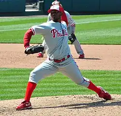 After Brett Myers tore his labrum and was placed on the 15-day disabled list, Philadelphia called up Bastardo on June 2, 2009.[11][12] He won in his first start against the San Diego Padres, allowing only one earned run during his six innings pitched.[13][14] After his Phillies' debut, Bastardo recorded a 2–3 record with a 6.75 ERA and 19 strikeouts. On June 25, during a start against the Tampa Bay Rays he suffered a shoulder injury[15] that forced him to go on the disabled list.[16][17][18] He returned to the Phillies roster for the postseason, where he made a relief appearance in the second game of the National League Division Series against the Colorado Rockies, striking out Jason Giambi with two outs and the bases loaded.[19] He gave up a double to the only other batter he faced in the postseason, Andre Ethier during Game 1 of the National League Championship Series.[20][21]