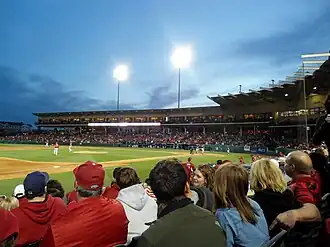 The Razorbacks play baseball home games in Baum-Walker Stadium at George Cole Field, which holds 11,749.[3] Arkansas was the first program in the nation to have an average attendance over 8,000 for the course of the season.[4] Baum Stadium has hosted NCAA regionals in 1999, 2004, 2006, 2007, 2010, 2017, 2018, 2019, 2021 and 2023. The Arkansas baseball team also hosted an NCAA Super Regional in 2004 against Florida State, in 2015 against Missouri State, in 2018 against South Carolina, in 2019 against Ole Miss, in 2021 against North Carolina State, and again in 2025 against Tennessee. One of the games in the 2015 Super Regional series against Missouri State set the all-time stadium attendance mark at 12,167. The first game of the South Carolina Super Regional series had 11, 722 in attendance making it the 3rd highest attended game in Baum stadium history. Baum stadium was voted top ballpark in collegiate baseball by Baseball America, 20 years after claiming the top spot in a 1998 poll.[5]