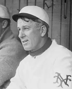 While Cy Seymour coached third base for the Giants during a game against the Philadelphia Phillies, Seymour tackled Moose McCormick as he rounded third base and headed for home plate. When Giants manager John McGraw asked why, Seymour made an excuse about having the sun in his eyes.[10] This led McGraw, realizing the need for a full-time coach, to hire Latham for the role, the first full-time coach in MLB.[11] Latham tried to do the same things in New York as he had done years earlier in St. Louis, but times had changed and screaming obscenities was not looked well upon, as baseball was being changed into more of a family-friendly game by then. In the opinion of Giants player Fred Snodgrass, however, he was "probably the worst third base coach that ever lived".[1] After the 1910 season, Latham was let go by the Giants.[12]
