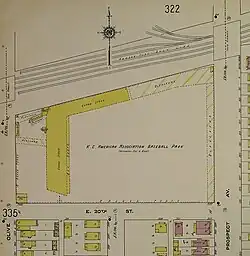 It was on a block bounded by Prospect Avenue (east, left field); East 20th Street (south, right field); Olive Street (west, first base); and railroad tracks (north, third base). An early report indicated dimensions for left field as 330 feet (100 m) and for right field as 290 feet (88 m). If center field were a square corner, it would have been about 440 feet (130 m) from home plate.[Kansas City Journal, March 19, 1903, p.7]