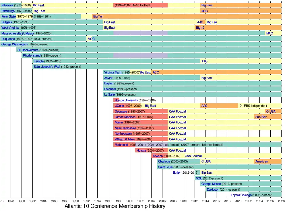 - ^ Duquesne left the A-10 for the Midwestern Collegiate Conference (now known as the Horizon League) only for the 1992โ93 school year, but returned to the A-10 effective the 1993โ94 school year.