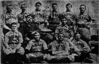 Standings at the end of the 1896 season, which had Newark finishing first, were formally protested by the Paterson team, claiming that some of Newark's games were actually exhibitions.[9] With that protest pending, the next two teams in the standings—Paterson and Hartford—arranged to play a series for the Soby Cup.[10] Paterson won the seven-game series, four games to two.[11] The protested standings were not ruled upon until the league's annual meeting in late November; despite inconsistencies in record-keeping, Newark was declared the pennant winner.[12]