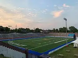 Kettering University received ownership after Flint Emergency Manager Mike Brown ordered the city to transfer ownership in 2013, with the university undertaking the cost of emergency repairs to permit the stadium to continue operation.[3] In 2015 the stadium underwent over $2 million in renovations to the restrooms, press box, concourse, exterior and playing field, and hosted Powers Catholic, Flint Southwestern and Flint Northwestern high school football in the fall of 2015. The new FieldTurf surface has permanent lines for regulation high school football, soccer, and lacrosse. The field goal posts are permanently mounted whereas soccer and lacrosse goals are moved into position as needed. As the field goal uprights are not hinged and therefore cannot be tipped back during soccer matches, the uprights are in bounds above the soccer goal.