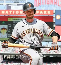 Avoiding arbitration, Slater and the Giants agreed on a $1.15 million salary for the 2021 season.[14] In the 2021 regular season, he batted .241/.320/.423 with 39 runs, 12 home runs, and 32 RBIs in 274 at bats, and stole 15 bases in 17 attempts (his 88.24% success rate led the National League).[12] As a pinch hitter, he led the major leagues with 13 RBIs, and tied for the major league lead with four home runs.[15] He primarily played center field, with stints in left field and right field (his perfect fielding percentage led all NL outfielders), and one game as a pitcher.[12]