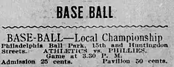 - ^ "Phillies-Athletics; Opening Game at the National's Ground Will Be Played Today". Philadelphia Inquirer. April 3, 1905. p. 10.