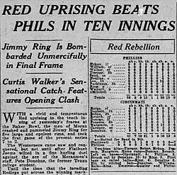 - ^ "Red Uprising Beats Phillies In Ten Innings". Philadelphia Inquirer. July 11, 1923. p. 20.